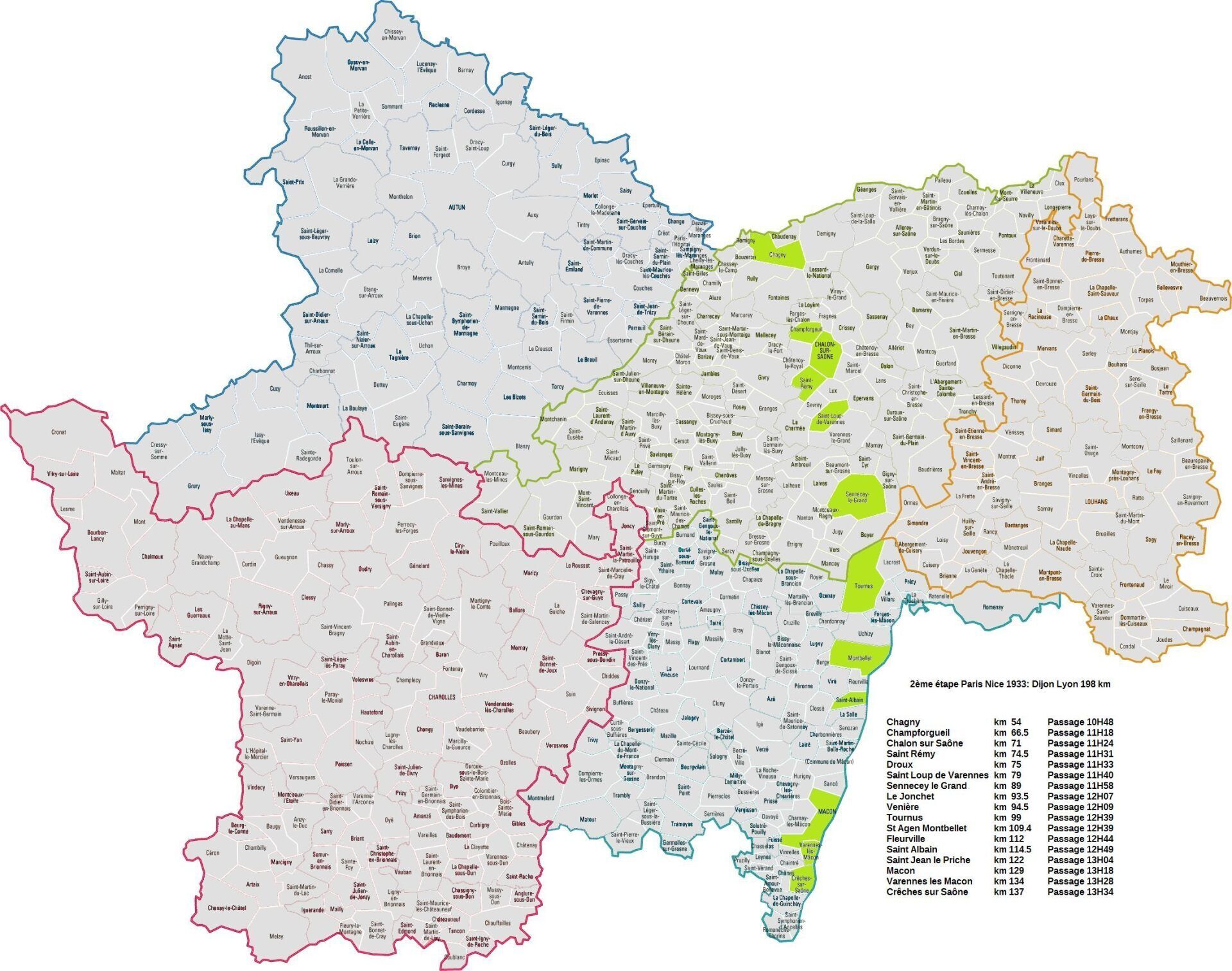 Avant 1939, le Paris-Nice a traversé deux fois le département de la Saône et Loire (en 1933 et 1935) selon un trajet suivant la nationale 6 : de Chagny à Crèches sur Saône en passant par Chalon sur Saône, Tournus et Macon.