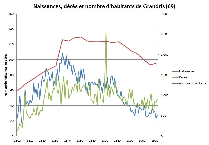 En supprimant ces actes (uniquement pour les naissances), et en ajoutant les données de population, voici le graphique de la commune de Grandris (69).