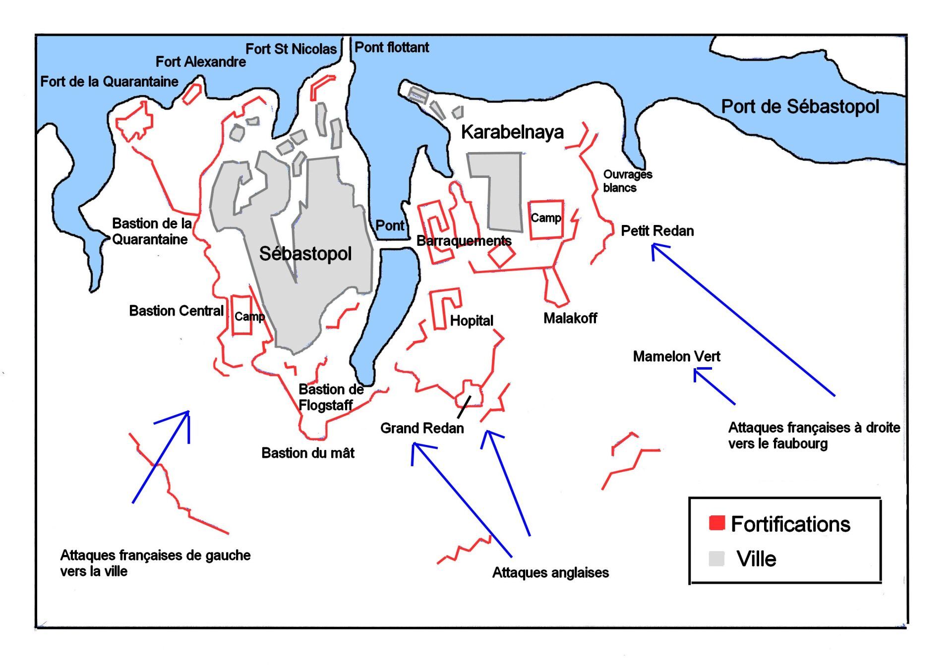« Les principaux ouvrages étaient, de l’ouest à l’est : la Batterie des Casernes, le Petit Redan, la tour Malakoff et, à 500 mètres en avant de Malakoff, le Mamelon Vert.