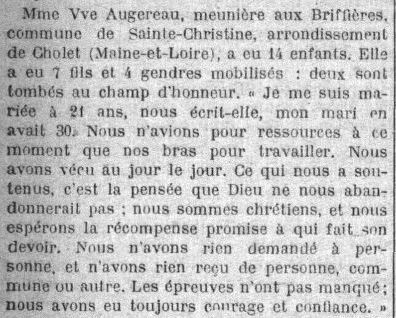 Mme Vve Augereau, meunière aux Briffières, commune de Sainte- Christine, arrondissement de Cholet (Maine-et-Loire), a eu 14 enfants. Elle a eu 7 fils et 4 gendres mobilisés : deux sont tombés au champ d’honneur. « Je me suis mariée à 21 ans, nous écrit-elle, mon mari en avait 30. Nous n’avions pour ressources à ce moment que nos bras pour travailler. Nous avons vécu au jour le jour. Ce qui nous a soutenus c’est la pensée que Dieu ne nous abandonnerait pas; nous sommes chrétiens, et nous espérons la récompense promise à qui fait son devoir. Nous n’avons rien demandé à personne, et n’avons rien reçu de personne, commune ou autre. Les épreuves n’ont pas manqué; nous avons eu toujours courage et confiance. »