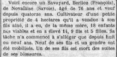 Voici encore un Savoyard, Berlioz (François) de Novalaise (Savoie), âgé de 76 ans et veuf depuis 14 ans. Cultivateur d’une petite propriété de 4 hectares qu’il a vendue à son fils aîné, il a eu, de la même mère, 18 enfants nés viables et en a élevé 14, 9 fils et 5 filles. Sa tâche n’a commencé à s’alléger que depuis huit ou neuf ans. Neuf de ses fils et un gendre ont été mobilisés. Un de ses fils est mort des suites de ses blessures.
