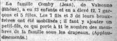 La famille Comby (Jean) de Valsonne (Rhône), a eu 13 enfants et en a élevé 12, 7 garçons et 5 filles. Les 7 fils et 3 de leurs beaux- frères ont été mobilisés; il faut y ajouter un petit-fils, ce qui porte à 11 le nombre des membres delà famille sous les drapeaux.