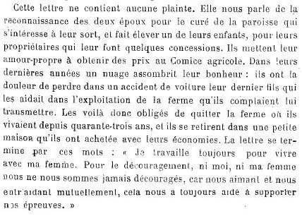Cette famille est dans la tradition de ces paysans robustes, sains de coeur et d’esprit qui sont l’honneur de nos campagnes. Jean Comby nous a raconté sa vie dans une lettre aussi touchante que simple. Marié à 24 ans à la veille de la guerre de 1870-1871, il part à l’armée pour en revenir bientôt assister à la naissance de son premier enfant. Rien de plus reposant que le tableau qu’il nous trace de son existence de labeur. « Redoublant de courage, nous aidant mutuellement, ma femme et moi, nous vivions pour notre enfant, car tous deux aspirions à la famille; puis il en vint un deuxième,