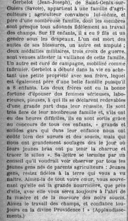 Gerbelot (Jean-Joseph), de Saint-Genix-sur-Guiers (Savoie), appartient à une famille d’agriculteurs; agriculteur convaincu lui-même, et père d’une nombreuse famille, dont les membres sont presque tous adonnés fidèlement au travail des champs. Sur 12 enfants, il a eu 9 fils, et un gendre sous les drapeaux. L’un est mort des suites de ses blessures, un autre est amputé; deux médailles militaires, trois croix de guerre, sont venues attester la vaillance de cette famille. Un autre est curé de campagne, mobilisé comme infirmier. Gerbelot a débuté dans la vie en achetant une petite propriété avec son frère, lequel est également père d’une belle famille puisqu’il a 8 enfants. Les deux frères ont eu la bonne fortune d’épouser des femmes sérieuses, laborieuses, pieuses, à qui ils se déclarent redevables d’une grande part dans leur réussite. Ils sont très fiers de leur nombreuse famille, et s’ils ont eu des heures difficiles, ils en sont sortis grâce au concours de tous ces enfants, « grands et solides gars qui dans leur enfance nous ont coûté bien des sueurs et des soucis, mais qui nous ont grandement soulagés dès le jour où leurs jeunes bras ont pu tenir la charrue et tracer le sillon ».