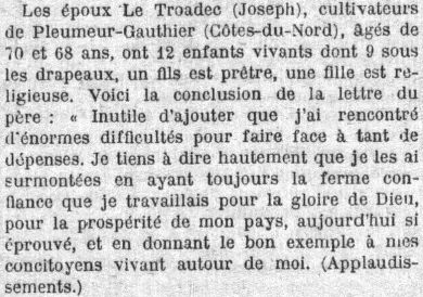Les époux Le Troadec (Joseph), cultivateurs de Pleumeur-Gauthier (Côtes-du-Nord), âgés de 70 et 68 ans, ont 12 enfants vivants dont 9 sous les drapeaux, un fils est prêtre, une fille est religieuse.