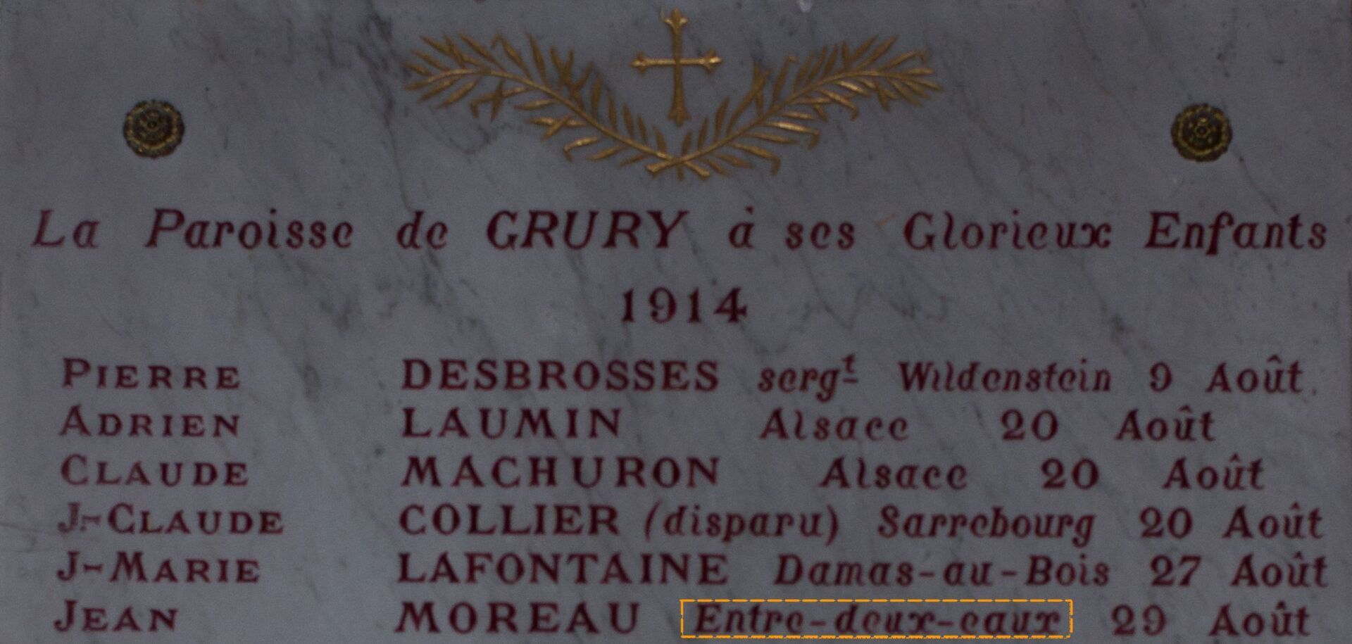 Sur la plaque de l’église de Grury, son décès est noté à Entre Deux Eaux.