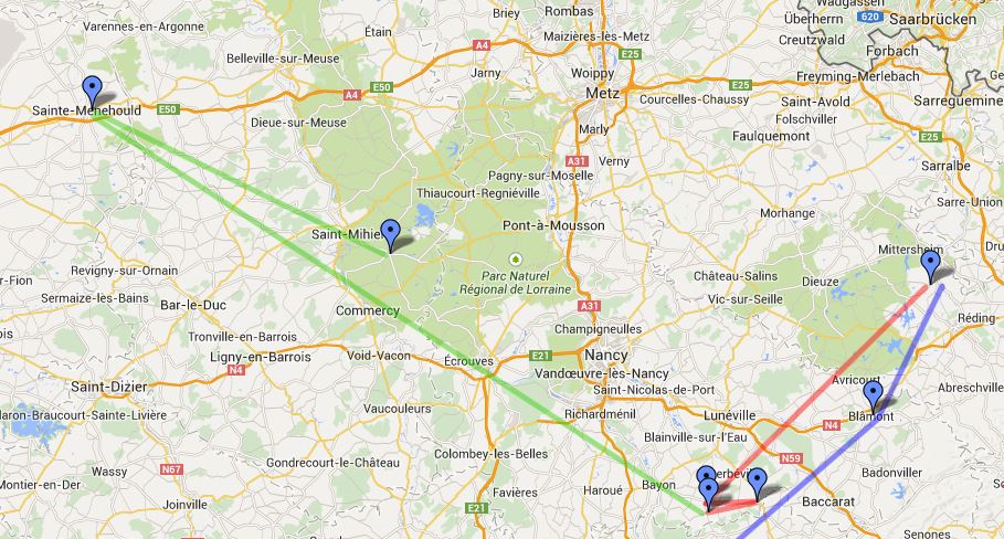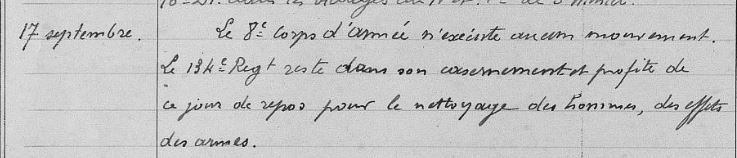 Le 12 septembre, il est chargé d’entraver la retraite des ennemis. Le 15 septembre le régiment embarque à Charmes par le train en direction de Lérouville puis St Mihiel où il séjourne à la caserne Négrier en cours de construction.