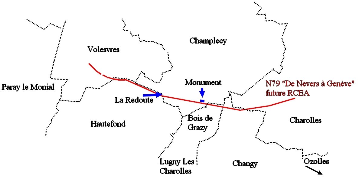 Si on regarde un plan actuel, on se rend compte de plusieurs choses. Le lieu dit La Redoute n’est pas situé sur la commune de Paray le Monial (lieu de déclaration des décès). La limite entre les communes de Champlecy et Changy ne sont pas en bordure de la nationale 79.