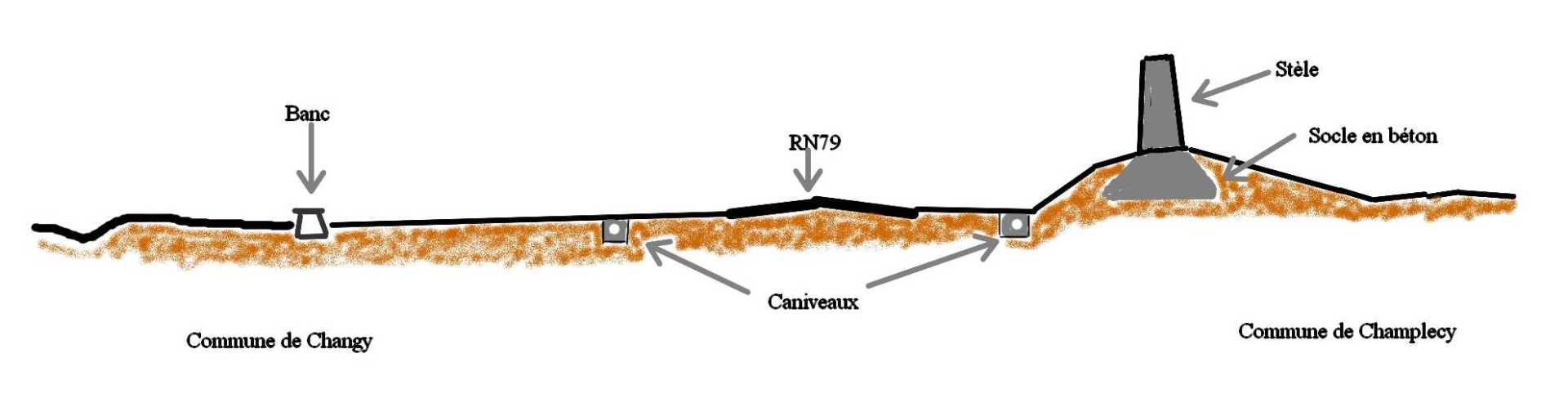 D’un côté de la route, sur la commune de Champlecy et sur un terrain cédé par Mr Boudry, expert géomètre à Paray, on trouve une stèle en granit brut de St Maurice les Châteauneuf à forme de pyramide tronquée, posée sur un massif en béton recouvert de terre végétale destinée à recevoir une pelouse et surélevée par rapport à la route (1,30m).