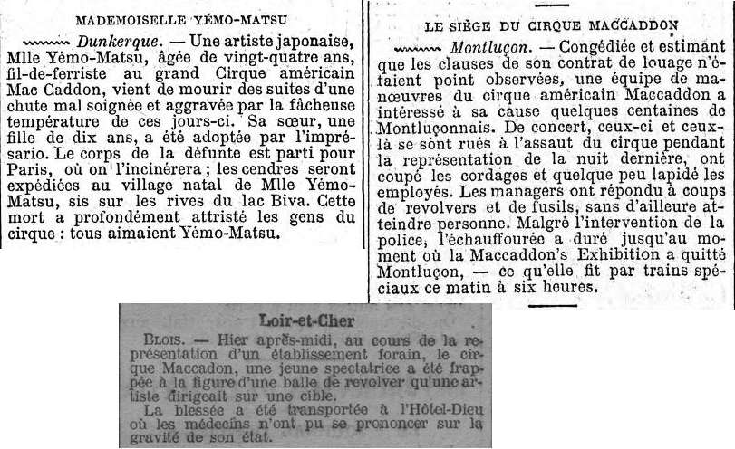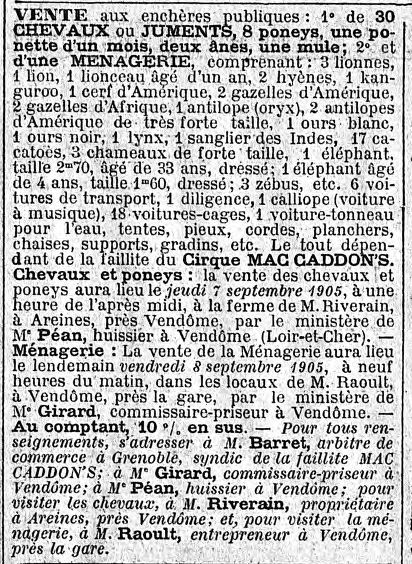 « La troupe se promena au hasard d’une ville à l’autre et vint s’échouer à Vendôme » (le 25 juin 1905) « où Maccadon laissa sa ménagerie ne gardant avec lui que le strict nécessaire, parti pour l’Auvergne jouant ici ou là sans grand succès. »