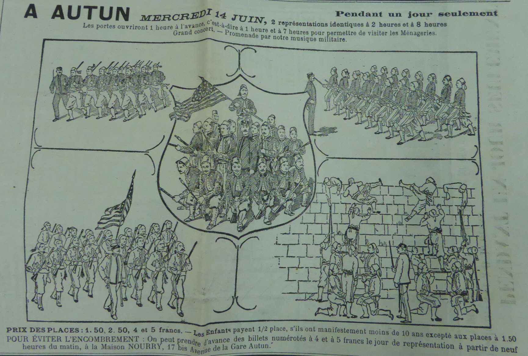 Le programme prévoit également une promenade par musique militaire et un concert. On aperçoit sur l’affiche les « zouaves escaladeurs de remparts. »