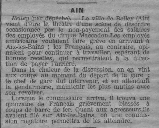A Belley (01) le 31 juillet, une rixe eut lieu entre les américains et les français qui composaient la troupe. Une vingtaine de ces derniers durent être soignés à l’hôpital.
