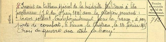 Dans le JO du 9 juin 1922, il reçoit la médaille militaire à titre posthume. Croix de Guerre avec étoile de bronze