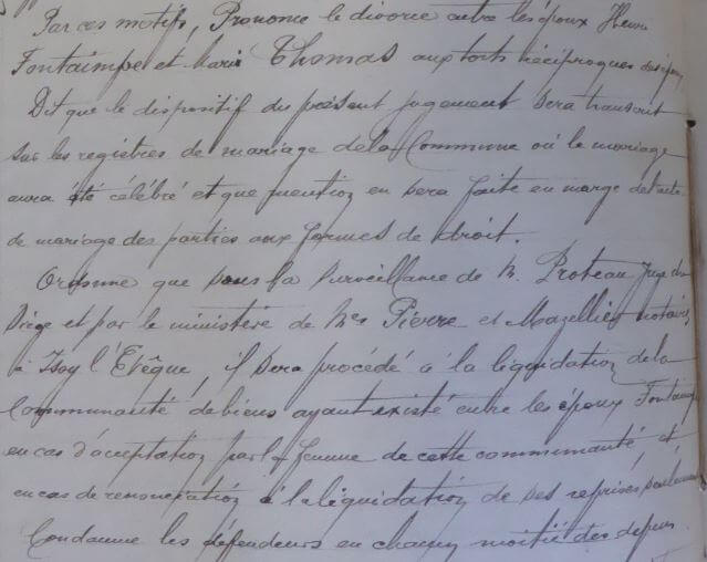 Le 28 décembre 1903, le juge Protheau fait part du résultat des enquêtes et contre enquêtes qui ont lieu au sujet du couple Fontaimpe-Thomas qui demande le divorce.