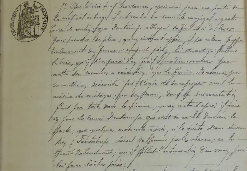 Le 19 mai 1913, Mr Fontaimpe est rentré à 4H du matin de l’auberge et a obligé sa femme à se lever pour prendre sa place. Un instant après, il s’est relevé et a frappé sa femme à coups de poings, lui disant qu’il allait la tuer. Il s’est alors emparé d’un fusil puis d’un revolver pour mettre ses menaces à exécution et Mme Fontaimpe a dû aller se réfugier dans la cuisine pour se cacher. Surexcité, Mr Fontaimpe a tiré des coups de feu dans la cuisine avant de mettre en joue sa femme. Cette dernière est partie se cacher derrière la porte. Quelques instants plus tard, alors qu’ils discutaient, le mari a attrapé l’époux par les cheveux et il a fallu l’intervention d’un voisin pour les séparer.