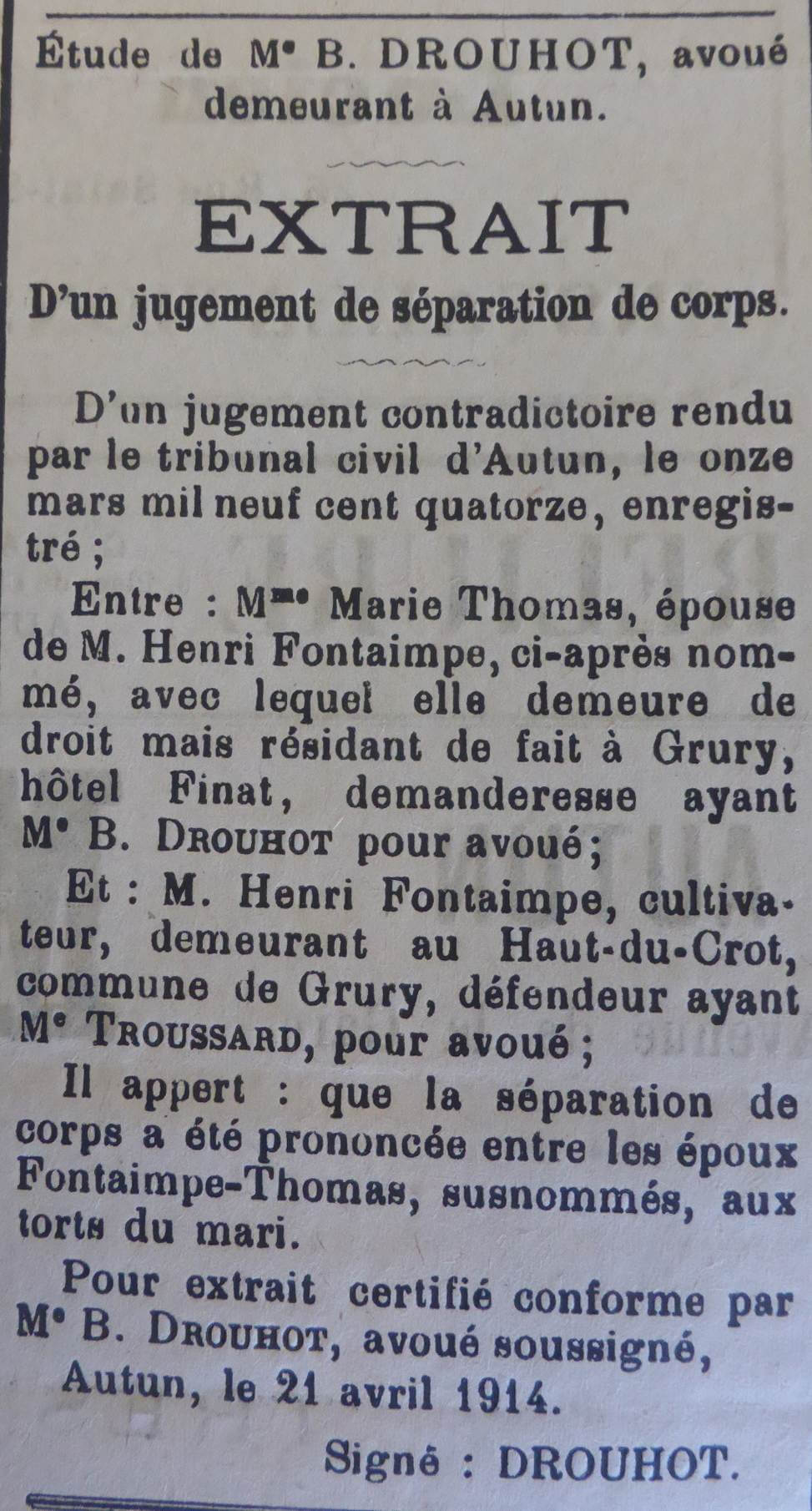 Le divorce est prononcé par le tribunal d’Autun le 27 avril 1904 aux torts réciproques des époux et les notaires Mazoyer et Pierre sont chargés de procéder à la liquidation de la communauté.
