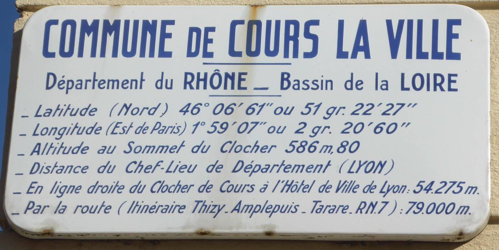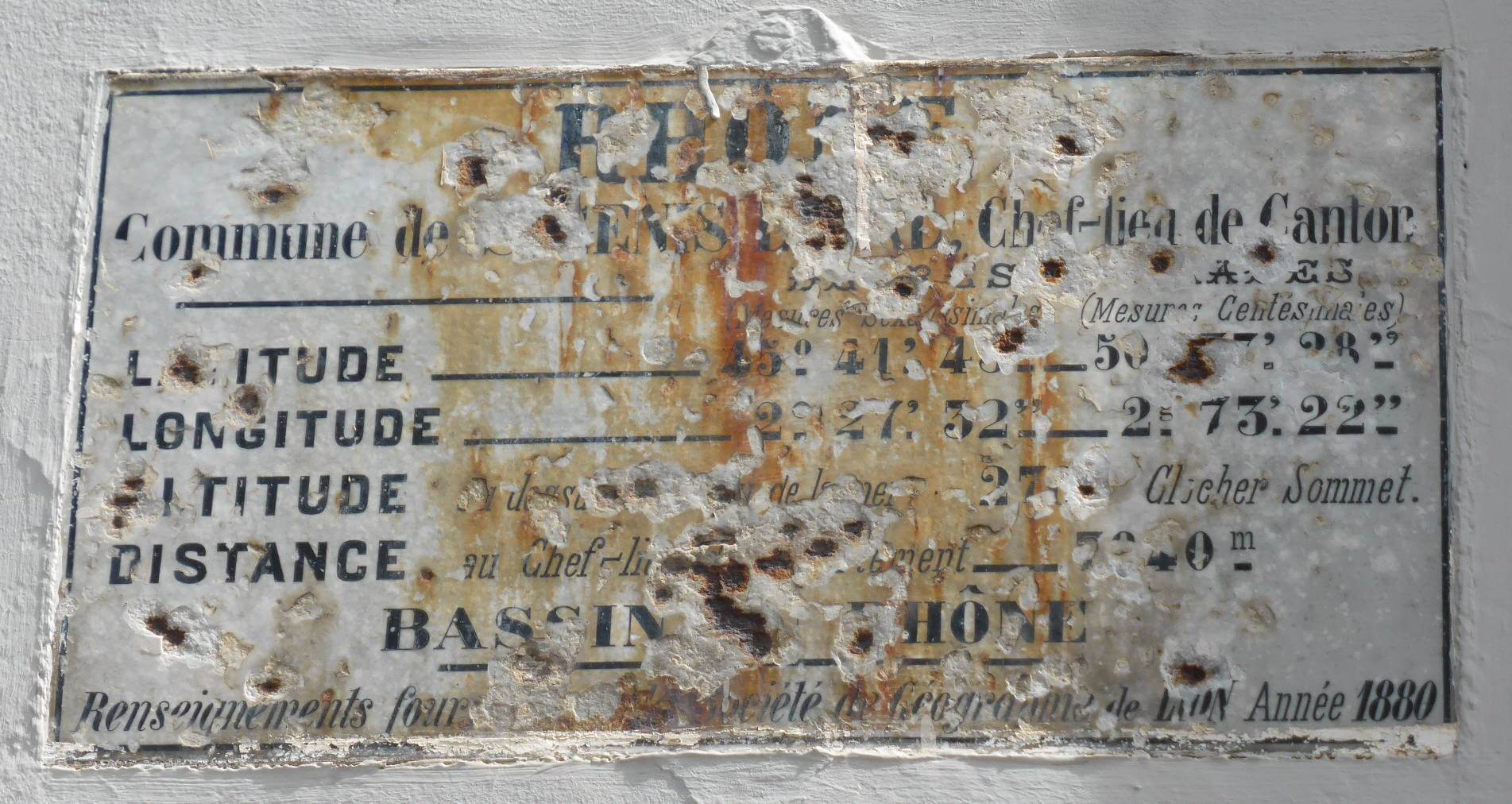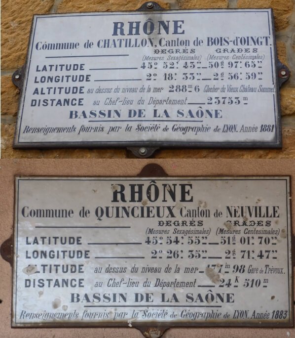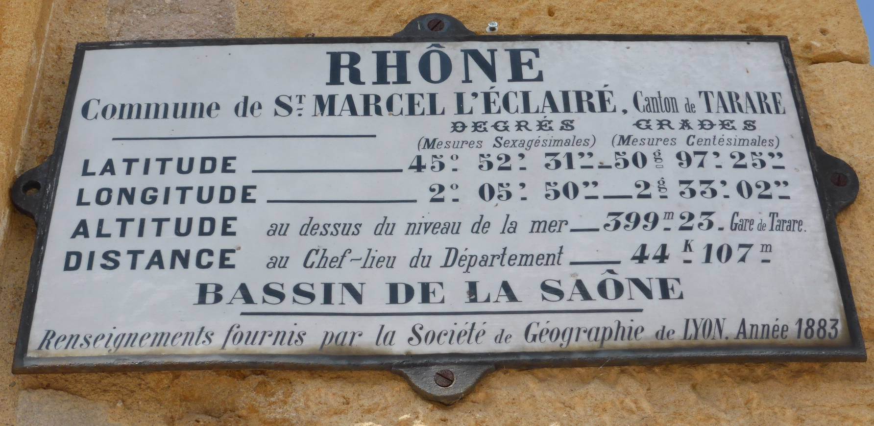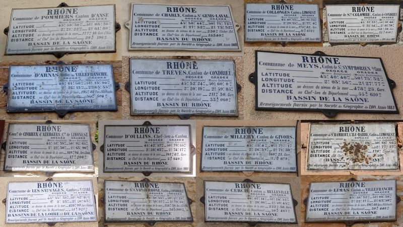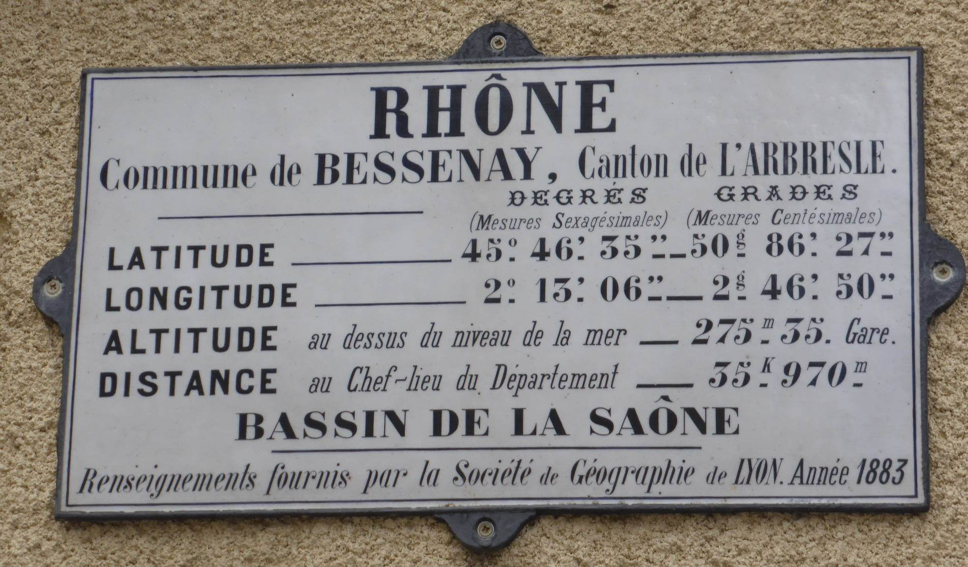 C’est en 1877 que la société propose, de doter les communes du Rhône de plaques géographiques avec le nom du département et de la commune, la distance qui la sépare de son chef lieu, l’altitude et la longitude. Cette idée semble émaner de Mr Jean Claude Coint Bavarot, membre fondateur.