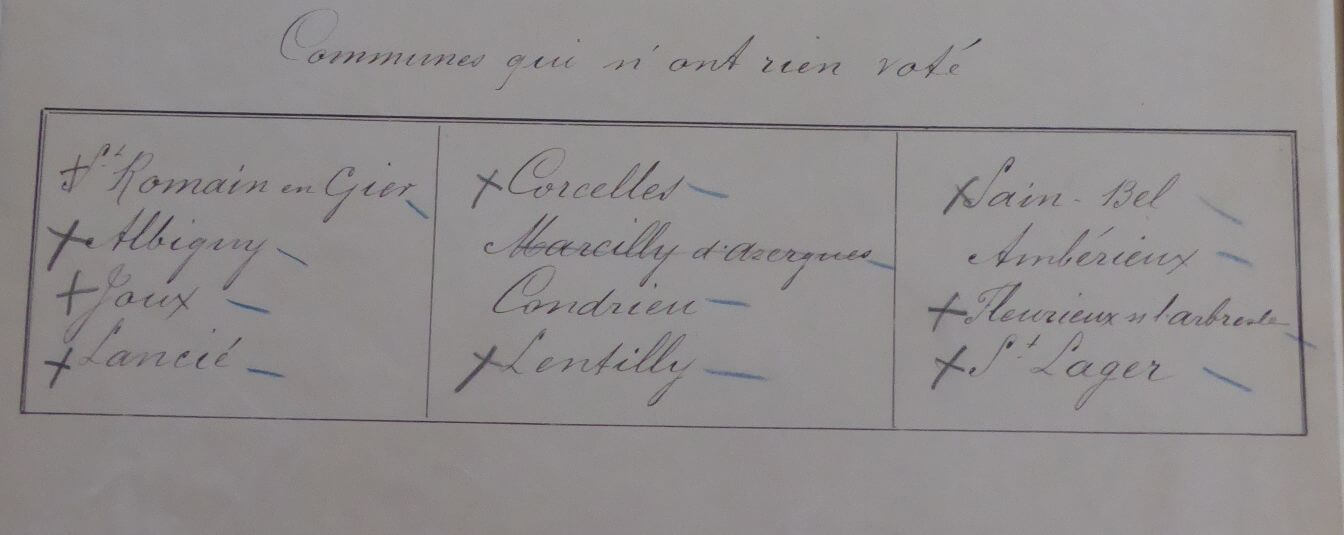A Lentilly, le conseil municipal n’a aucun fonds pour cette dépense , surtout que la commune est « obligée de contribuer pour la plus grande partie aux frais de logement, d’éclairage et de chauffage des hommes chargés de procédé au relevé des coordonnées géographiques tandis que les autres communes faisant partie du même rayon sont affranchies de ces frais. » Un an plus tard, les 12,50 francs sont budgétisés.