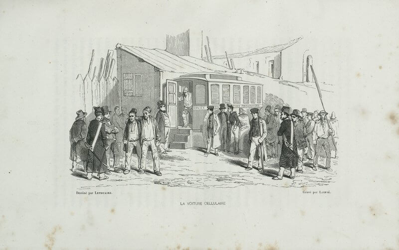La voiture cellulaire arrive. Elle appartient à Mr Guillot, entrepreneur du transport des forçats aux bagnes , qui a signé un contrat de 9 ans avec l’état. Le conducteur porte un uniforme et est armé. Il n’a cependant pas le droit de se servir de ses armes sauf en cas de légitime défense. Il est responsable des forçats et si l’un d’eux venait à s’échapper, l’entrepreneur est pénalement responsable et doit payer une amende de 3000 francs par évadé.