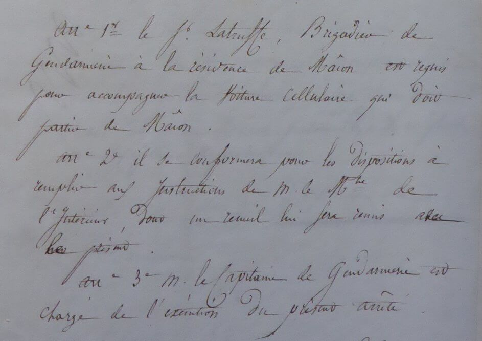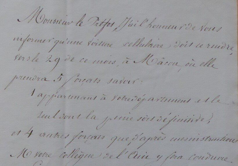 Le 21 juin 1838, le ministère de l’intérieur prévient le préfet de Saône et Loire qu’une voiture cellulaire doit se rendre vers le 29 du même mois à Mâcon pour prendre en charge 5 forçats , dont 4 de l’Ain.