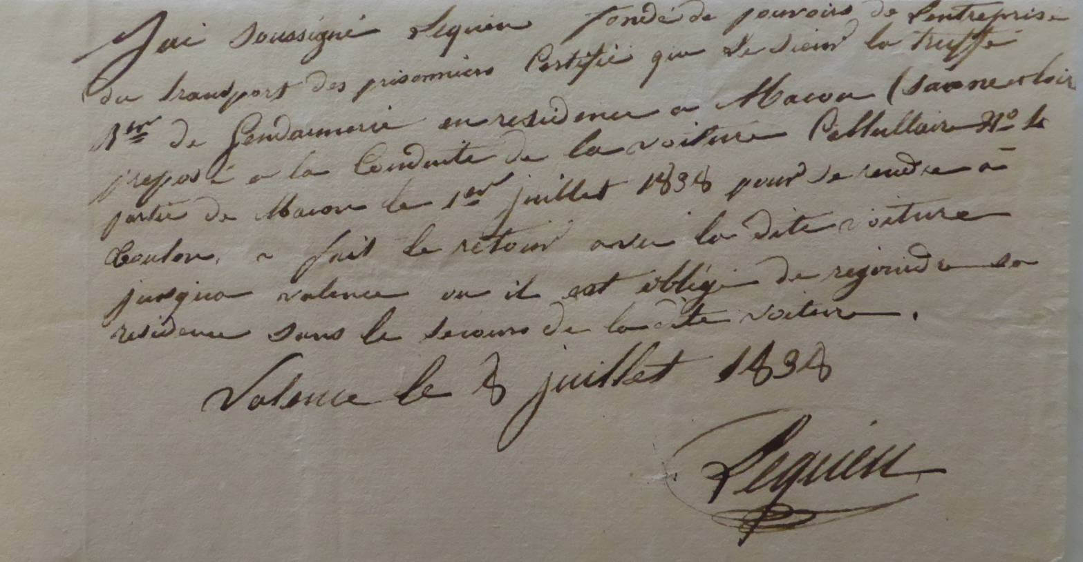 Claude Latruffe va accompagner le convoi parti le 1 er juillet de Mâcon jusqu’à Valence où il est remplacé par le brigadier Chaniard. Il reçoit une attestation du représentant de l’entrepreneur de transport et il fait le trajet du retour à pied.