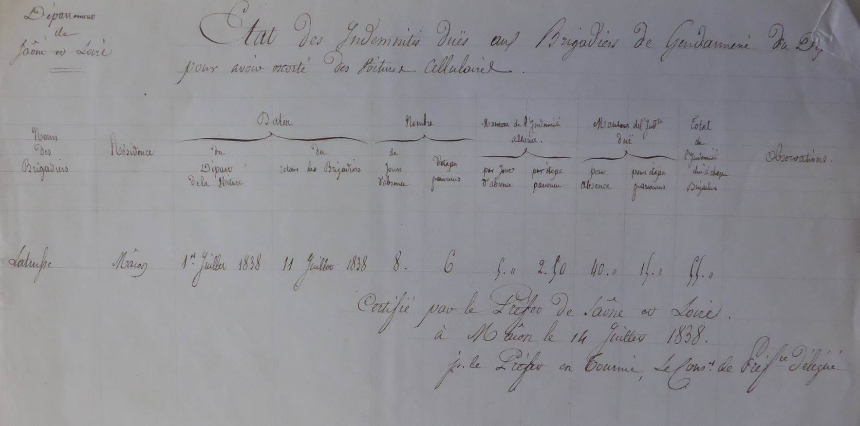 Il sera indemnisé à hauteur de 5 francs par jour d’absence (comprenez les 8 jours dans la voiture cellulaire) et de 2,50 francs par étapes (comprenez les 6 villes de sa feuille de route) soit 55 francs qu’il recevra le 19 aout 1838.