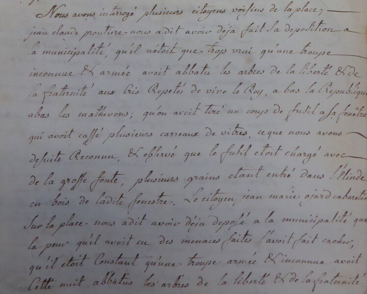 La troupe était organisée et des sentinelles surveillaient les maisons et chemins pendant la destruction de l’arbre. Des menaces ont été faites à la population et le cabaretier de la place a dû se cacher. D’ailleurs des coups de fusils ont été tirés et un carreau de fenêtre été cassé.