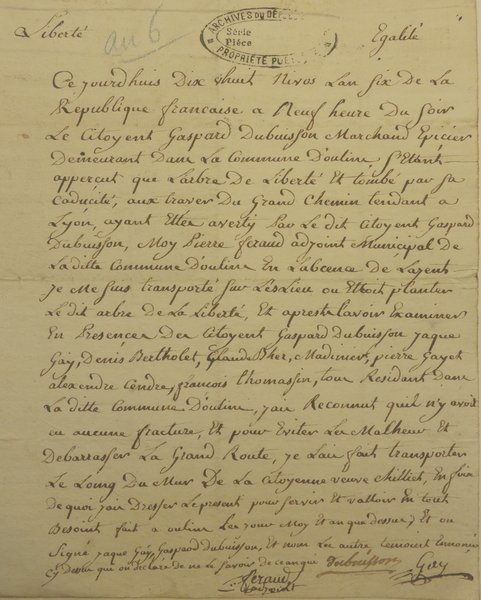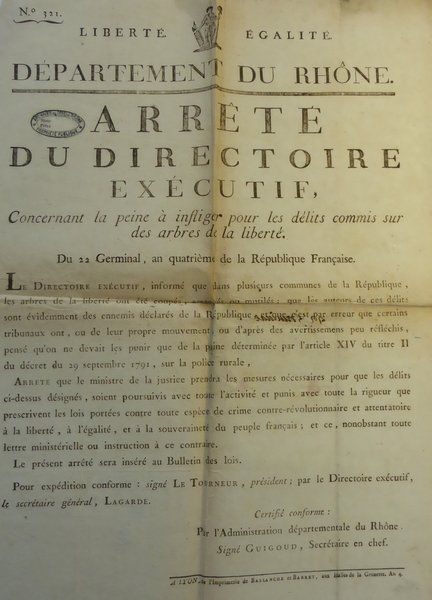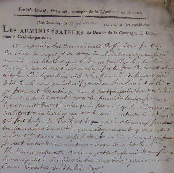 En frimaire an X (novembre 1801), l’arbre de Charentay est renversé, le commissaire du gouvernement s’empresse d’avertir le préfet du Rhône.