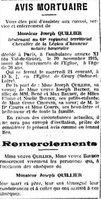 Joseph Quillier décède le 20 novembre 1915 à 70 ans de maladie à l’annexe n°11 de l’hôpital du val de Grâce, située dans la Villa Molière boulevard Montmorency à Auteuil.