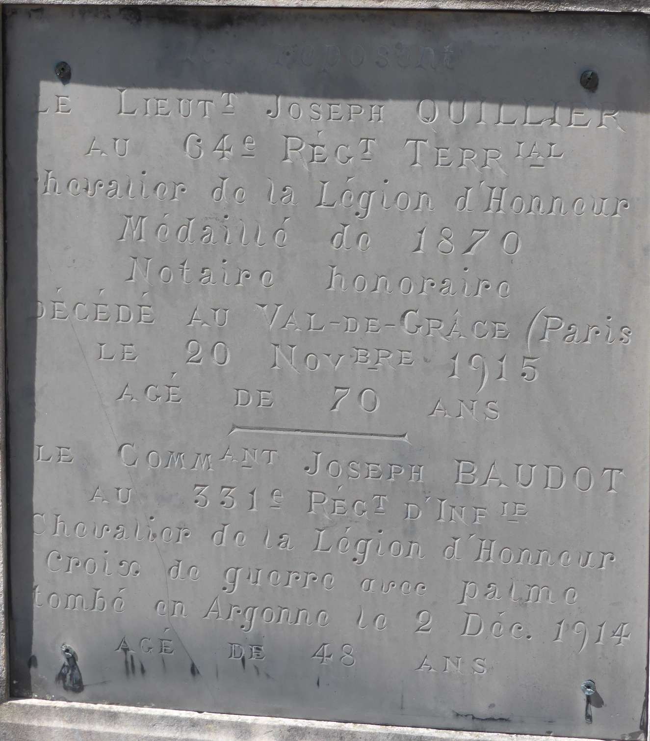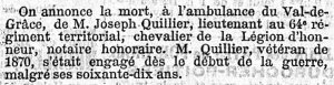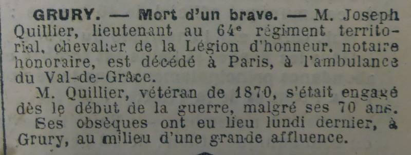 Quand éclate la guerre de 1914 , alors que son gendre est devient chef de bataillon du 331 ème régiment d’infanterie à Blois, Joseph Quillier se propose en tant que lieutenant au 64 ème RIT dans la section garde des voies de communication. Il a alors 69 ans, ce qui lui confère le grade d’ un des plus vieux lieutenants en activité. Il n’est pas le seul vétéran de 1870 au combat, on note dans la presse par exemple le nom de Charles Surugue, ancien maire d’Auxerre (89) âgé de 76 ans au moment de son engagement en juin 1915.