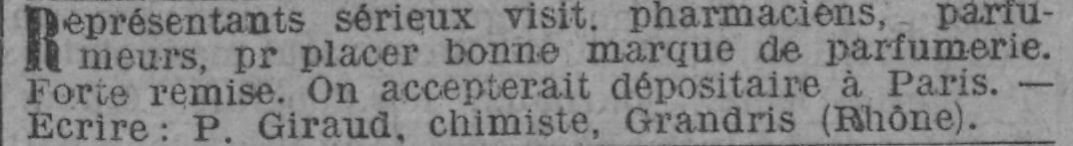 En 1905 il recherche des représentants et un dépositaire à Paris.