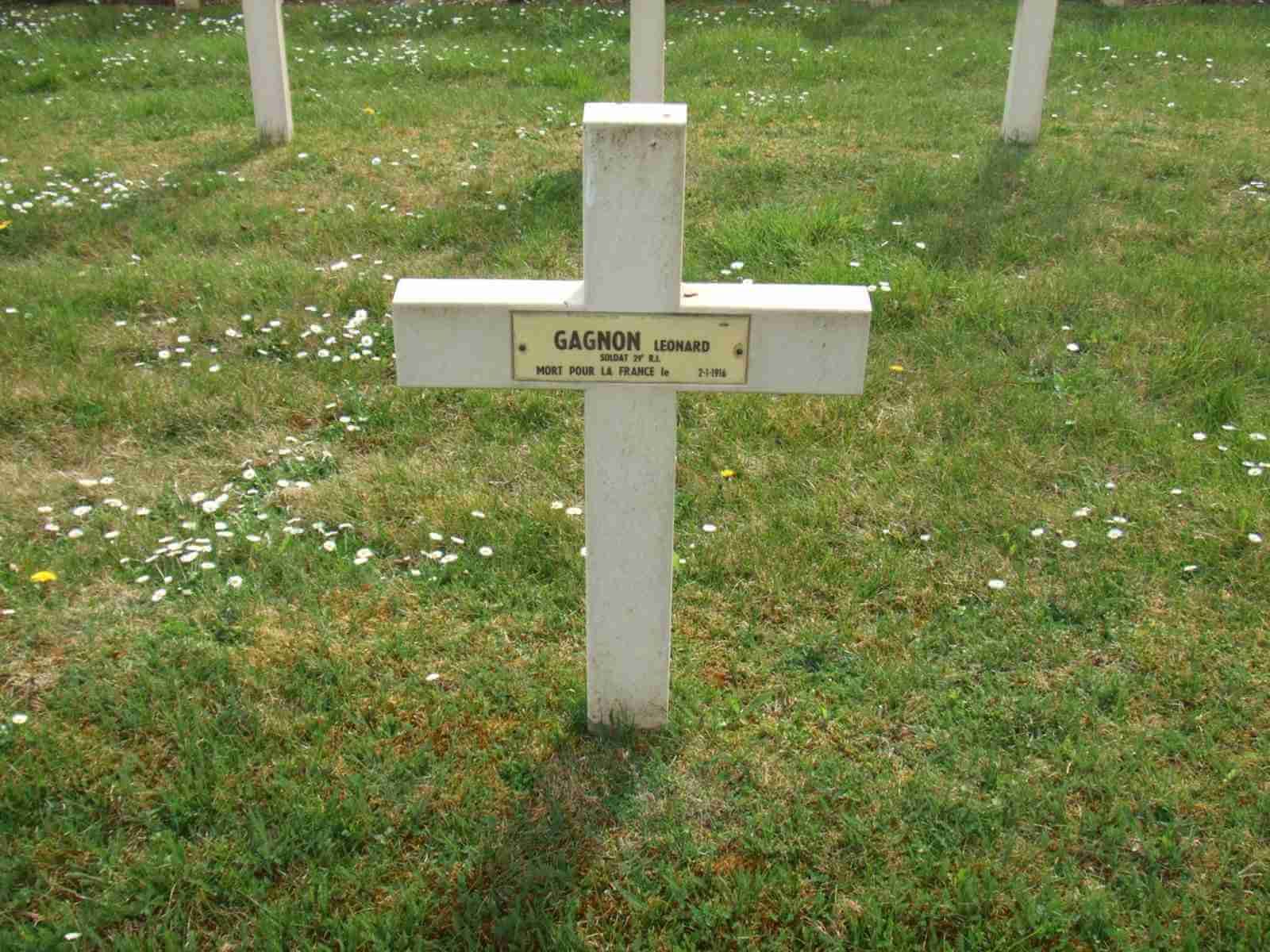 Léonard Gagnon est malade, pendant que ses camarades se battent dans le secteur d’Apremont la Forêt, il est à nouveau transporté à l’arrière où il décède à l’ambulance 11 à Ourches sur Meuse le 2 janvier 1916. Il avait 23 ans.