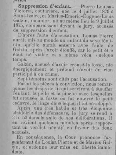 Lors de l’audience du 4 décembre 1901, Marius Galzin et Louise Pierre sont acquittés et libérés.