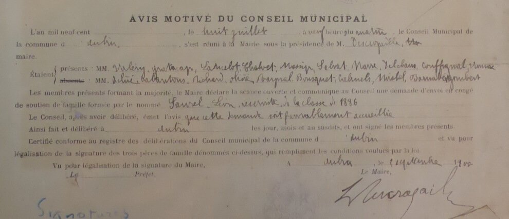 Nous sommes le 2 septembre quand Léon Saurel fait sa demande de dispense mais celle-ci est acceptée le 8 juillet… par anticipation ! Le secrétaire de mairie interrogé expliquera que pour faciliter les demandes de dispense, il a été convenu que la délibération de juillet 1900 serait utilisée pendant tout l’été en attendant la session de conseil municipal prévue dans le mois de septembre.