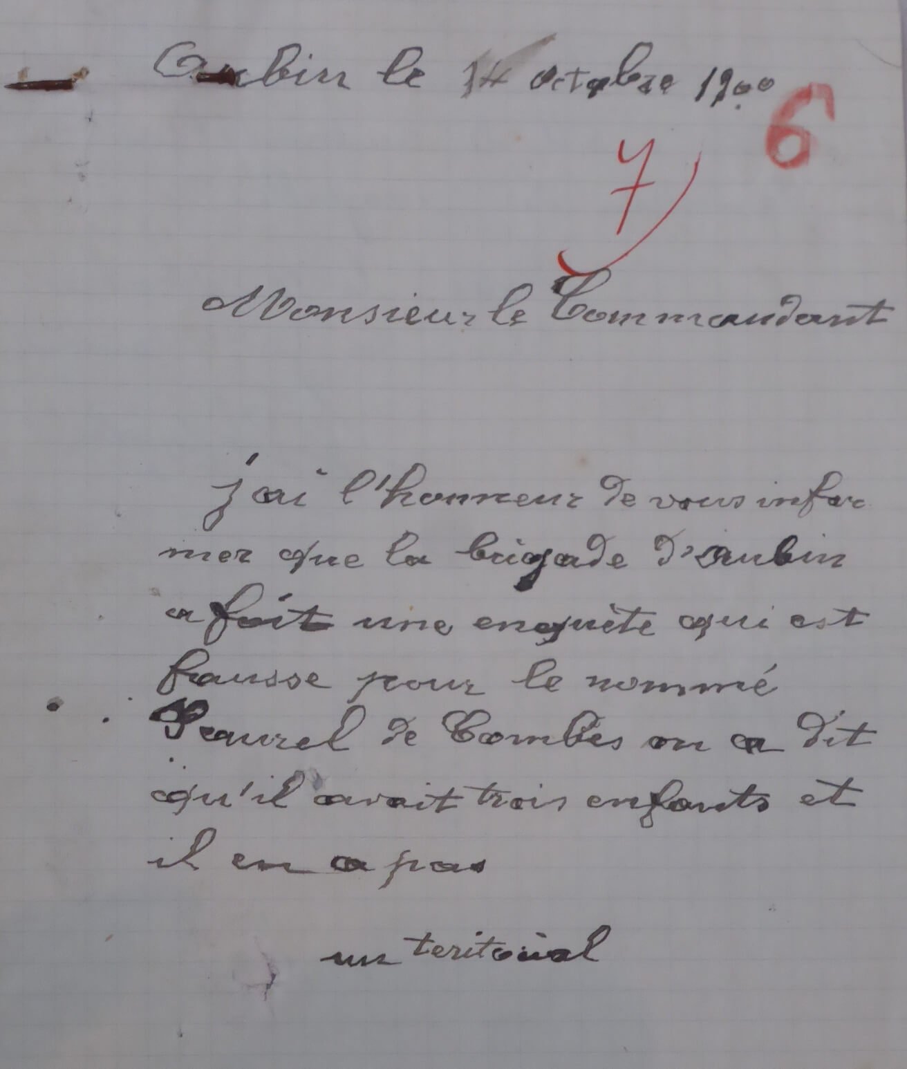 Le 8 septembre 1900, les gendarmes Xavier Brès et Marie Philibert Marnières se rendent au domicile de Mr Saurel pour une petite enquête suite à sa demande de dispense. Mme Saurel est absente. Bien que boiteuse, elle est partie rendre visite à ses parents.