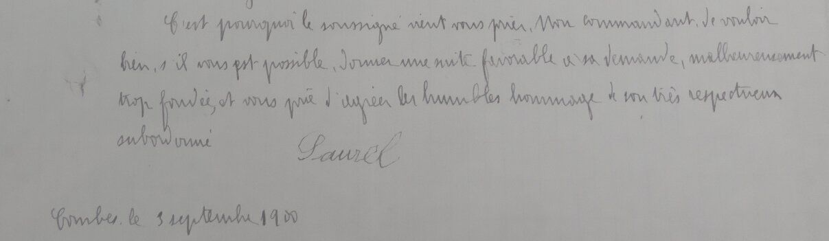 Sur les conseils du secrétaire de mairie, Mr Saurel revient en fin de matinée à la mairie et récupère son certificat rempli et signé. Comme il est illettré, le secrétaire de mairie écrit la lettre de dispense, la date du lundi 3 septembre 1900 et c’est Mr Saurel qui la dépose lui-même dans la boite aux lettres de la gare pour un départ au prochain train.