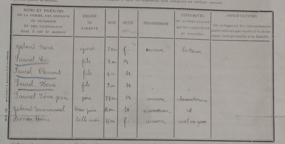 Une fois les 3 signatures réunies, Léon Saurel retourne à la mairie avec son certificat blanc et dicte au secrétaire les éléments manquants : ses enfants, son père à charge et ses beaux pères qu’il soutient financièrement.