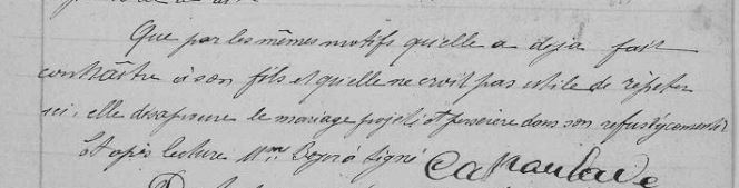 Le 29 septembre, Maitre Lunet de Rodez se rend chez la mère de Mr Capoulade et lui formule la demande. Mme Capoulade mère répond qu’elle a déjà fait connaître à son fils et qu’elle ne croit pas utile de répéter ici, elle désapprouve le mariage projeté et persévère dans son refus d’y consentir.