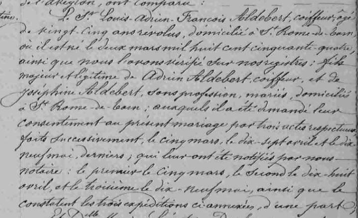 Louis Adrien François Aldebert coiffeur à St Rome de Tarn, 25 ans, supplie respectueusement ses pères et mères de lui donner leur conseil sur le mariage qu’il se proposer de contracter avec Melle Bouloc via un acte notarié le 5 mars 1879.
