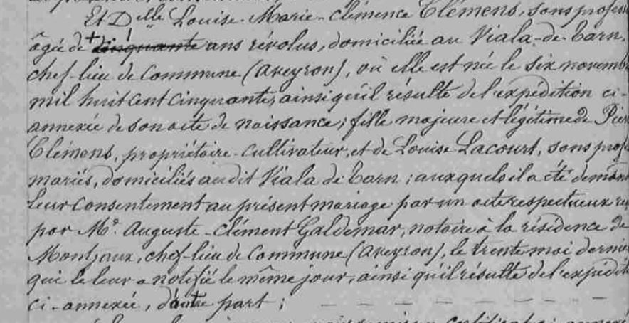Louise Marie Clémens, 31 ans, sollicite le 30 mai 1881 ses pères et mères de lui donner leur conseil sur son mariage projeté avec Jean Jules Aristide Lafon. Le notaire notifie les parents le jour même. Ceux ci refusent de donner leur consentement.