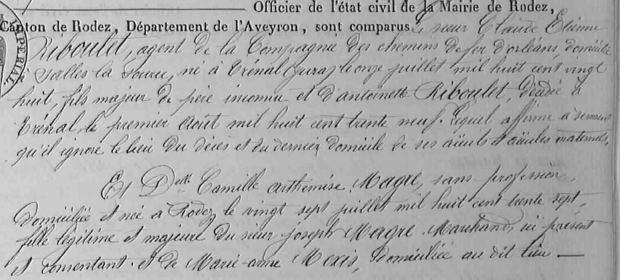 - Avec Camille Arthémise Magre, sans profession, domiciliée et née à Rodez le 27/07/1837, fille légitime et majeure de Joseph Magre, marchand, ici présent et consentant et de Marie Anne Mexis, domiciliée au dit lieu.