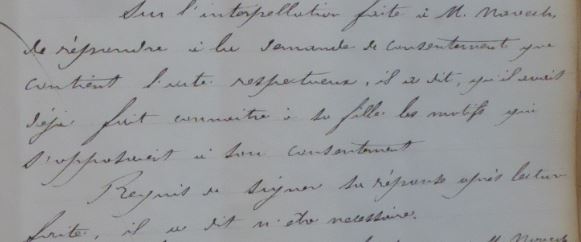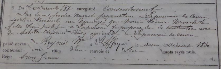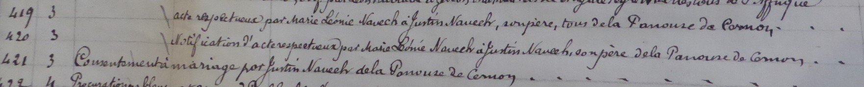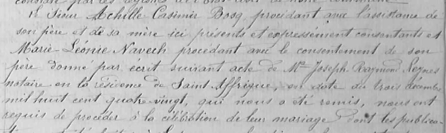 Marie Léonie Navech sollicite son père par acte respectueux le 3 décembre 1880 pour épouser Achille Casimir Bosq. Le notaire notifie cette demande à Mr Navech qui ne consent pas au mariage.