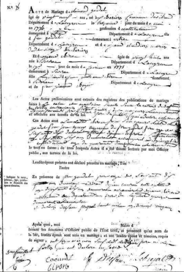 Alors que la loi prévoit qui, quand et quoi inscrire dans les actes, on dénote cependant quelques différences dans les formulations d’une commune à une autre. Pendant la période révolutionnaire apparaissent les imprimé s qui permettent à l’officier d’état civil de ne rien oublier, quitte à parfois sembler manquer de place.