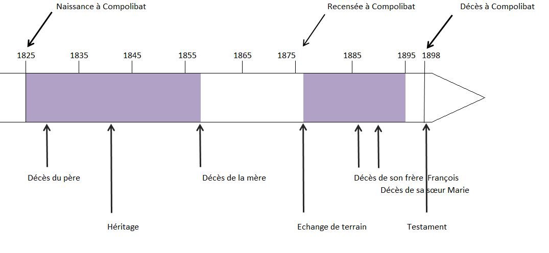 - Elle hérite de Catherine Mercadier de terres à Compolibat en 1841, qu’elle échange en 1876.