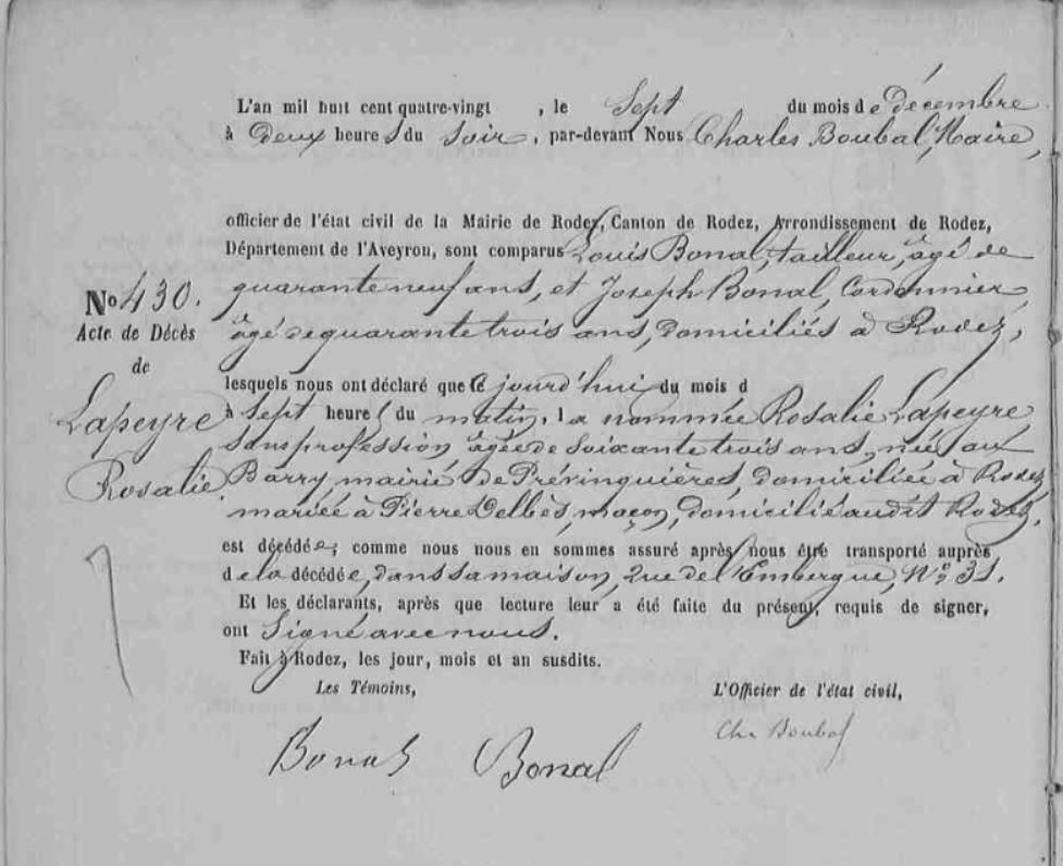 Son mariage a lieu en 1866 à Rodez, ce qui nous donne des éléments d’état civil : elle est née Compolibat comme son homonyme mais en 1818 de Georges et de Rose Viarouge (qui meurt en 1828). Rosalie Lapeyre est déjà à Rodez en 1855 puisqu’elle est condamnée cette année là par le tribunal de simple police.
