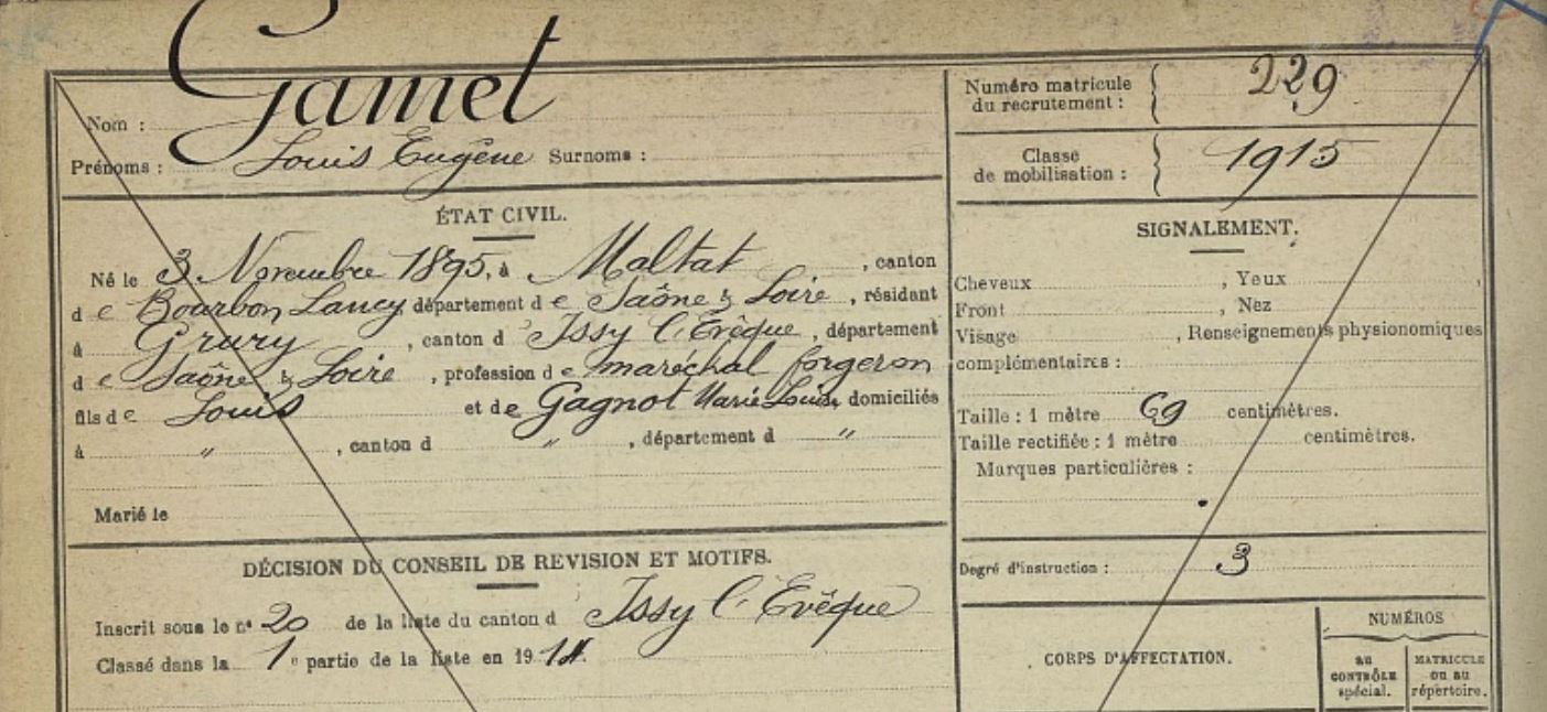 Louis Eugène Gamet est né le 3 novembre 1895 à Maltat (71) de Louis et de Marie Louis Gagnot.