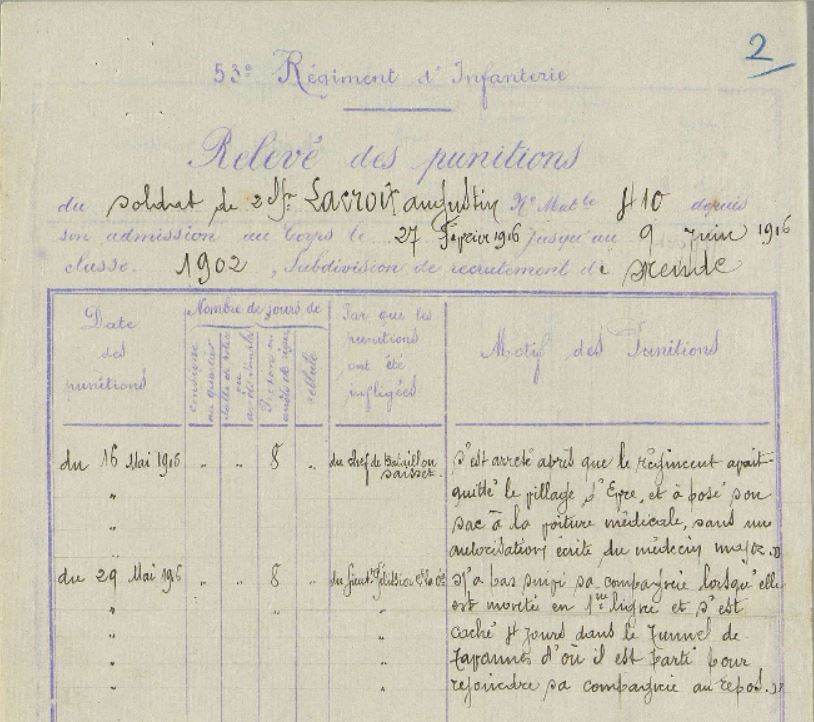 On découvre qu’il n’a pas de livret matricule. Les punitions antérieures à son arrivée au 53 ème RI ne sont pas connues. Depuis son admission à cette arme le 27/02/1916, il a eu 2 fois 8 jours d’arrêts : le 16 mai pour s’être arrêté après que le régiment ait quitté le village d’Evre et avoir posé son sac à la voiture médicale sans autorisation écrite du médecin.