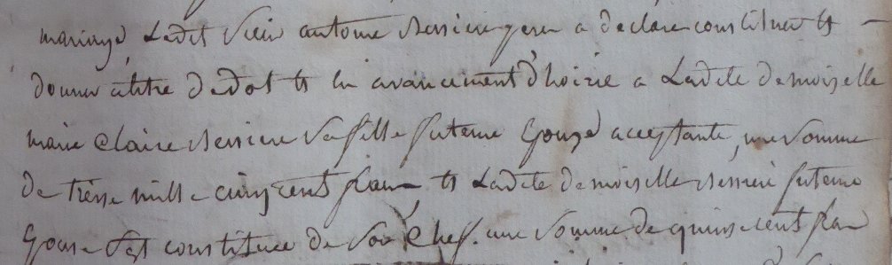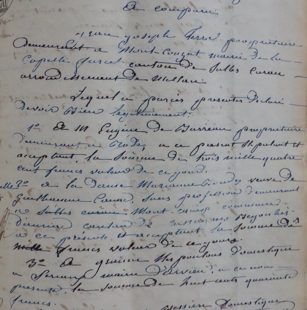 Du côté de la future épouse, les sommes sont plus importantes. Melle Bessière s’est constitué 1 500 francs de dot et son père lui donne 13 500 francs dont 12 000 francs payables avant sa mort. 3 000 francs sont même acquittés de suite.
