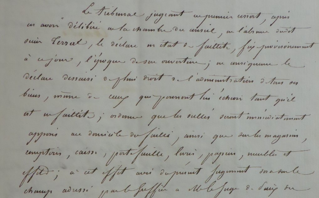 Un syndic provisoire, puis définitif, est nommé pour suivre la faillite de Mr Terral. Les créanciers ont indiqué les sommes qui leur sont dues et doivent justifier de la véracité de celle-ci.