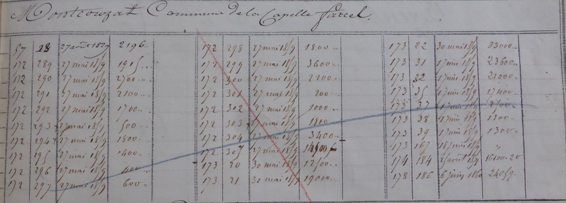 Ce qui est frappant, c’est un document consulté précédent : la case du répertoire de formalités d’hypothèques. Alors que la partie gauche est assez banale, celle de droite liste un grand nombre de créances pour de fortes sommes et toutes à la même période : mai 1859.